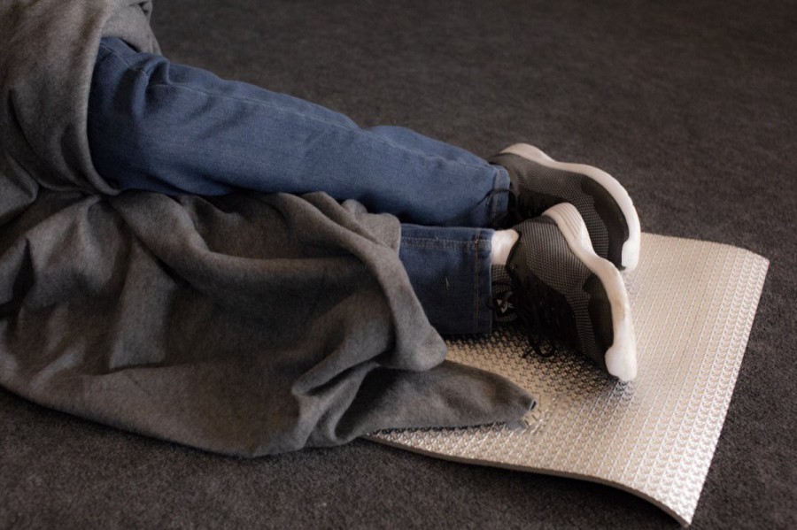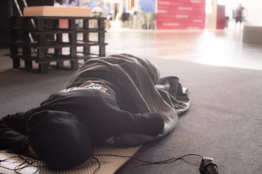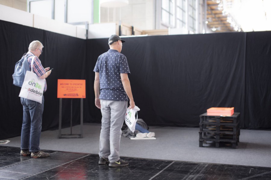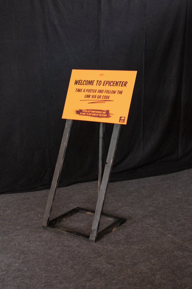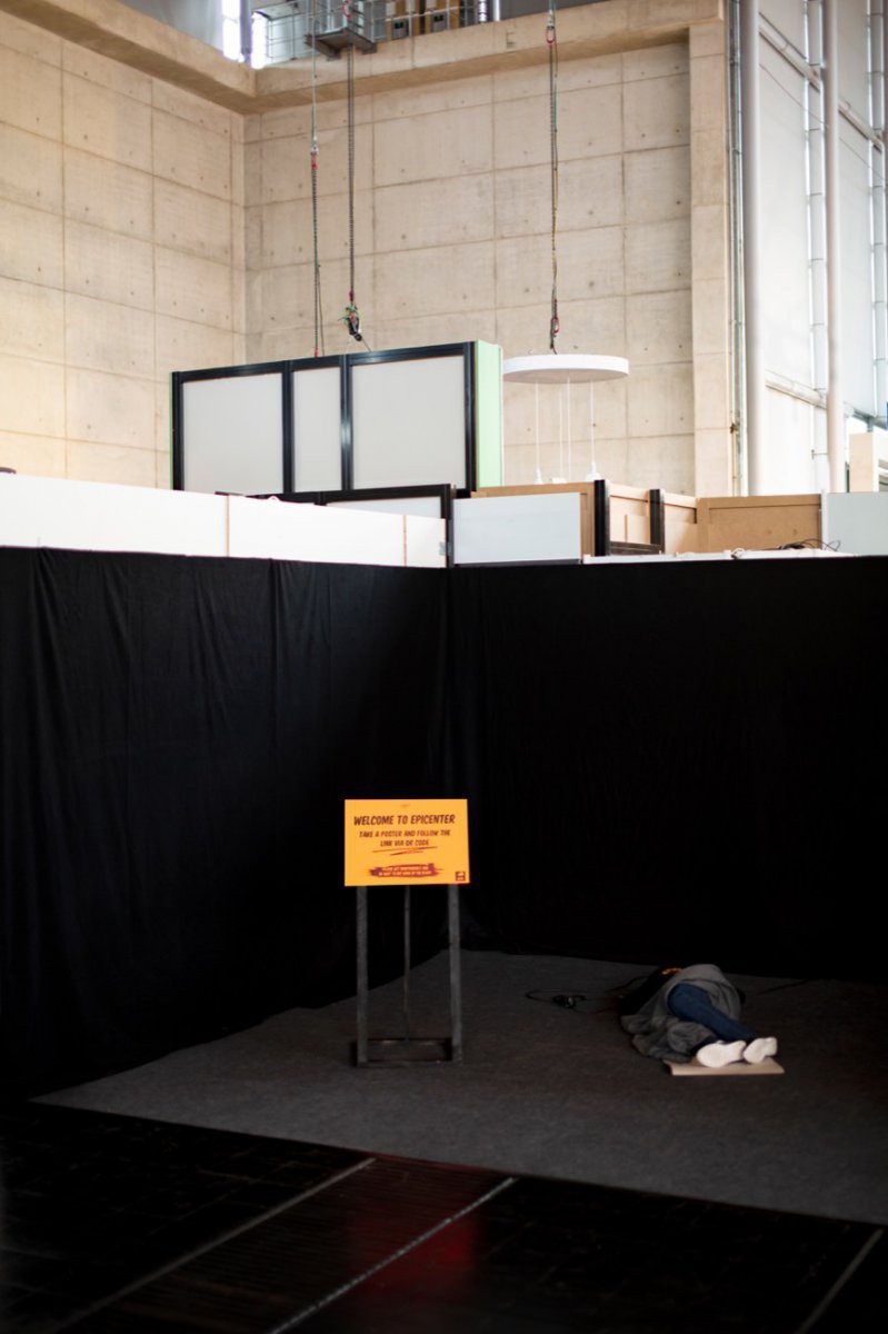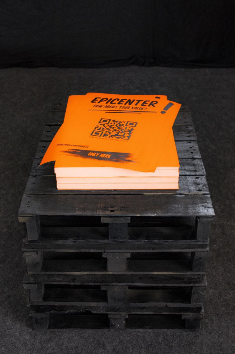 For an experimental booth at the annual tech fair Cebit 2018 we created the installation "Epicenter". Following Fuchsbau Festival’s 2019 edition "Supermarkt", we followed this topic by stressing to tackle issues of individualized capitalism. A rather empty fair booth with pitch black walls accommodated a life-like sleeping body, a security camera that overlooked the scenery with a screen showing the cameras view and a pile of neon orange posters on a stack of black pallets.
