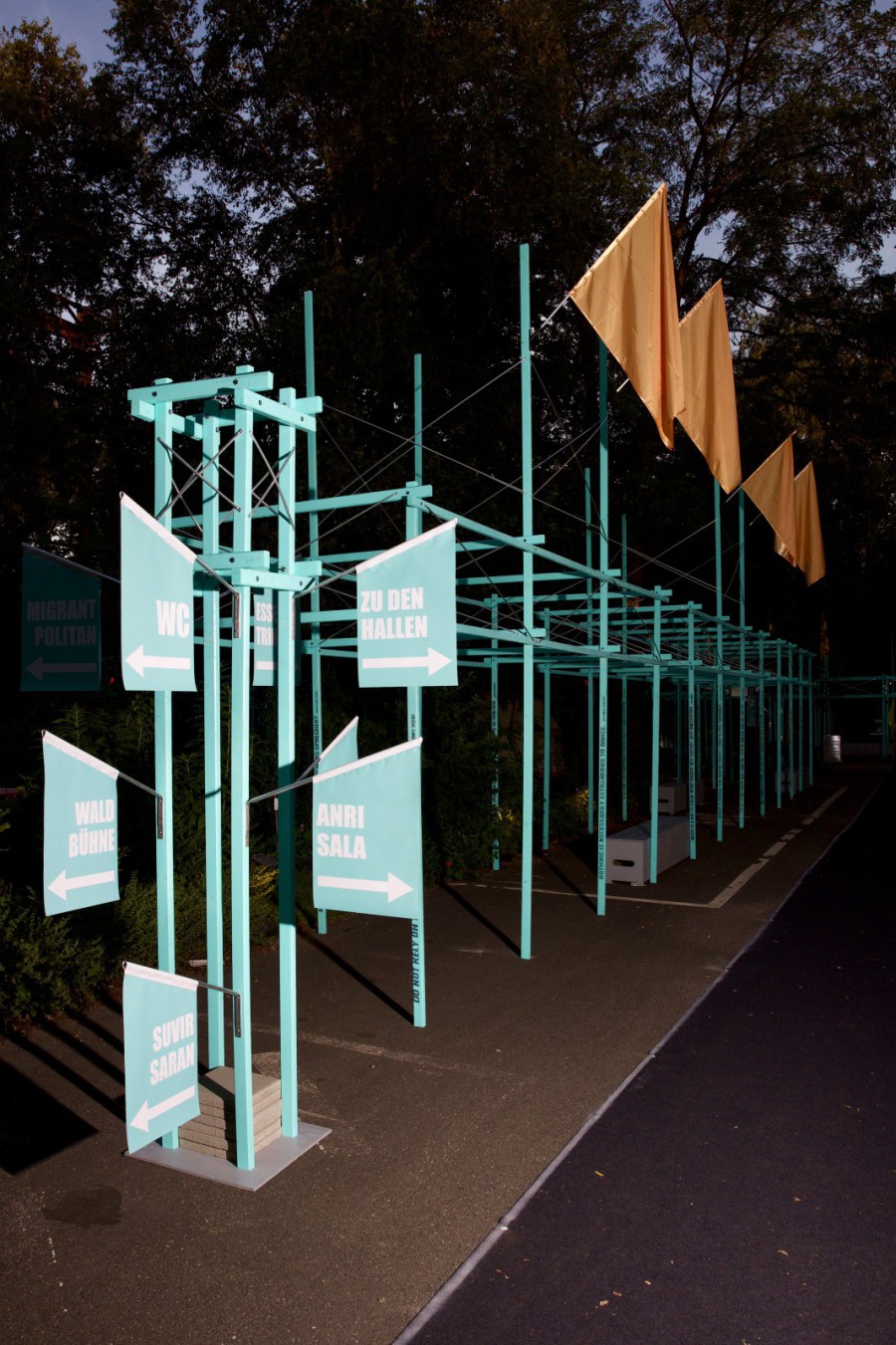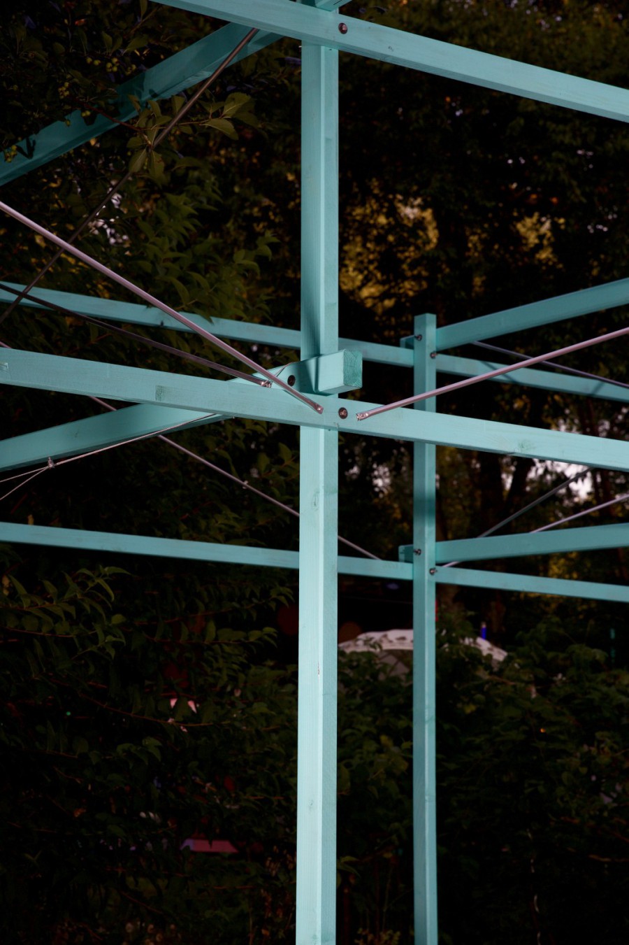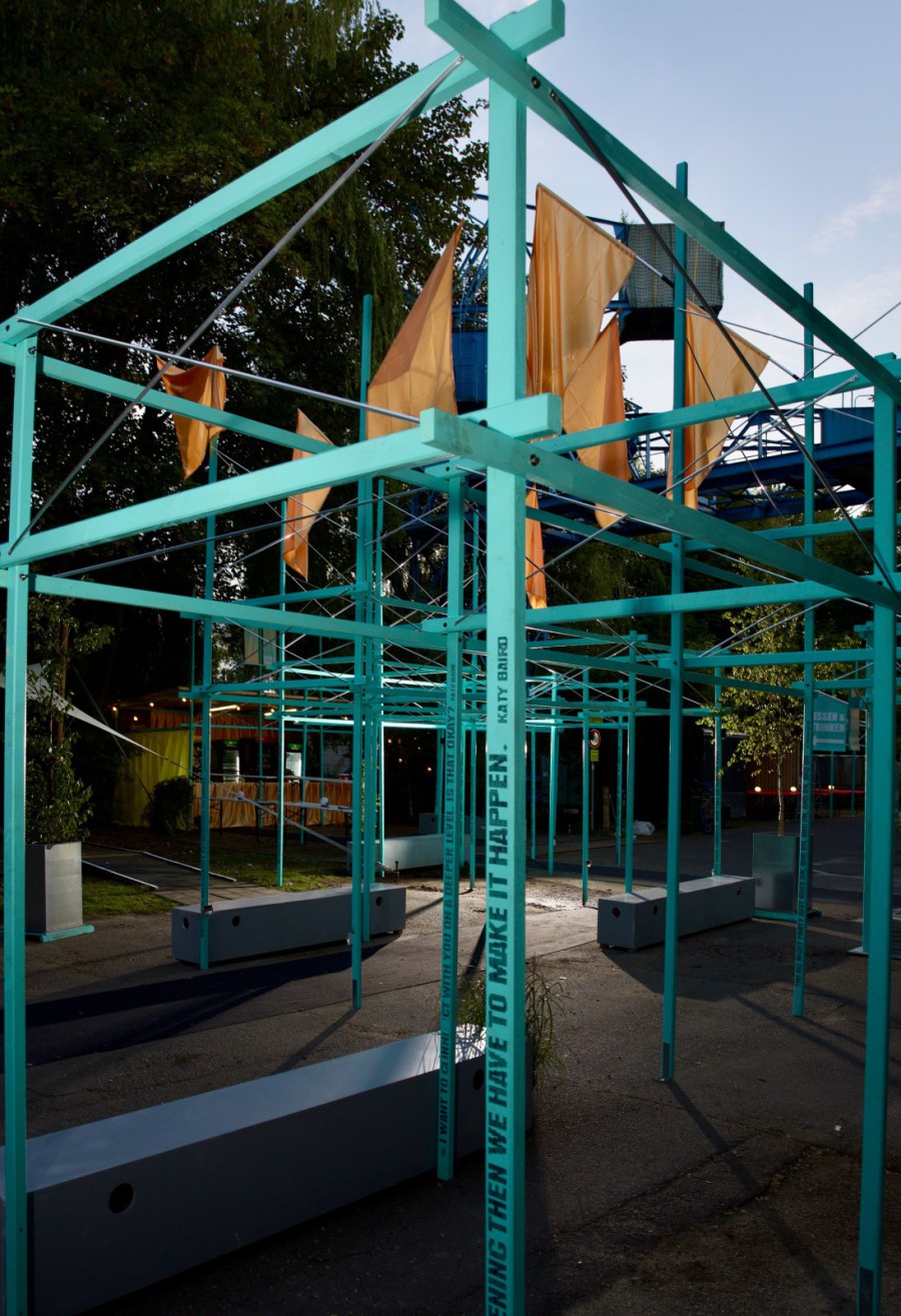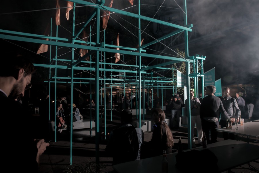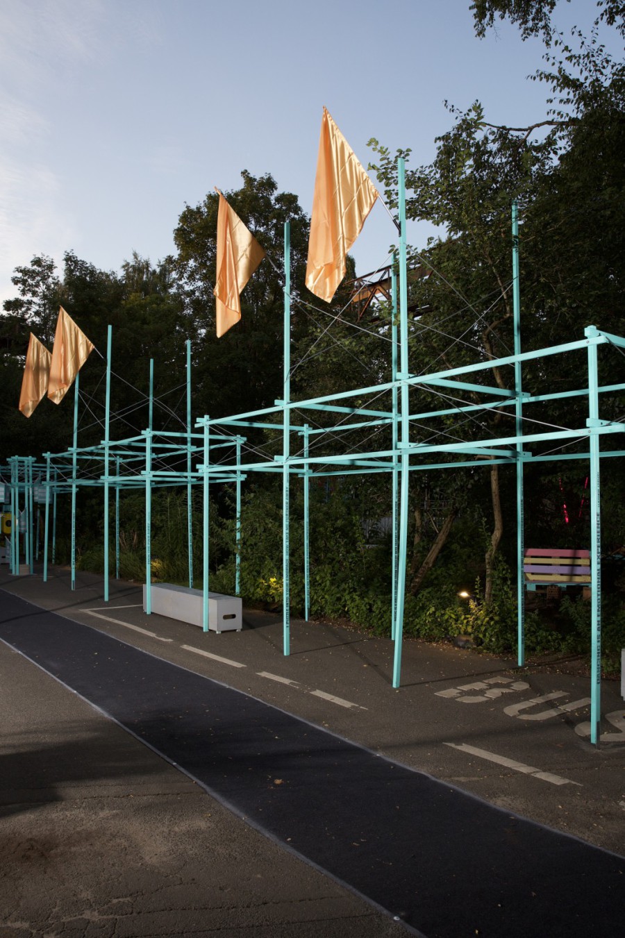 Thinking big, looking up: for the fourth time already, we conceived and realized the scenography for the International Summer Festival at Kampnagel. With this edition, we transformed the festival garden into a turquoise-colored forest made of stelae, aiming for the sky. Between the wooden tower-like structures we placed numerous seating areas and planters with trees — the stele constructions also formed their own paths in the midst of the forest of scaffolding, a pergola for strolling. For the production process we focussed on sustainable construction and made sure that 95% of all materials were used to be reused.