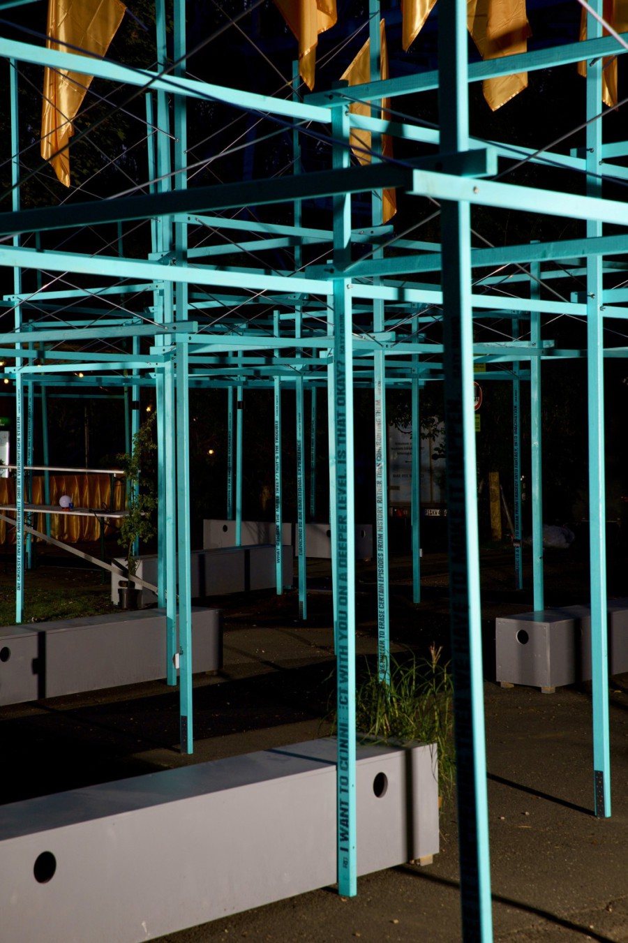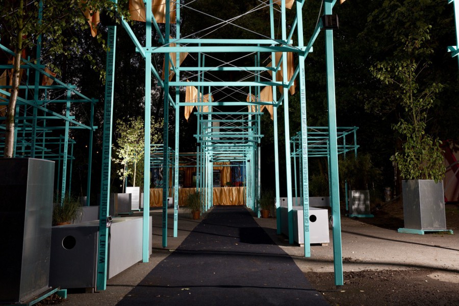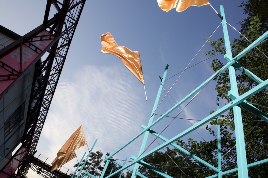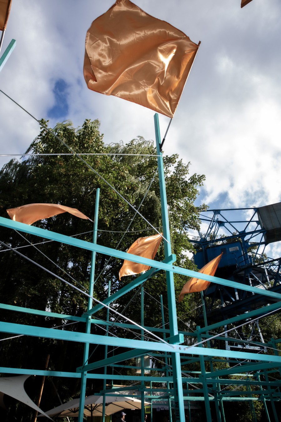 The visually impressive height of our modular scenography forest was being contrasted with turquoise-painted wood and apricot flags. These choices of color and form were play- and joyfully reminiscent of maritime aesthetics: in this way, we combined the height of the sight with the depth of the mind. For the latter, we explored how deep such thoughts can go by printing quotes by artists from the summer festival program on the wood.