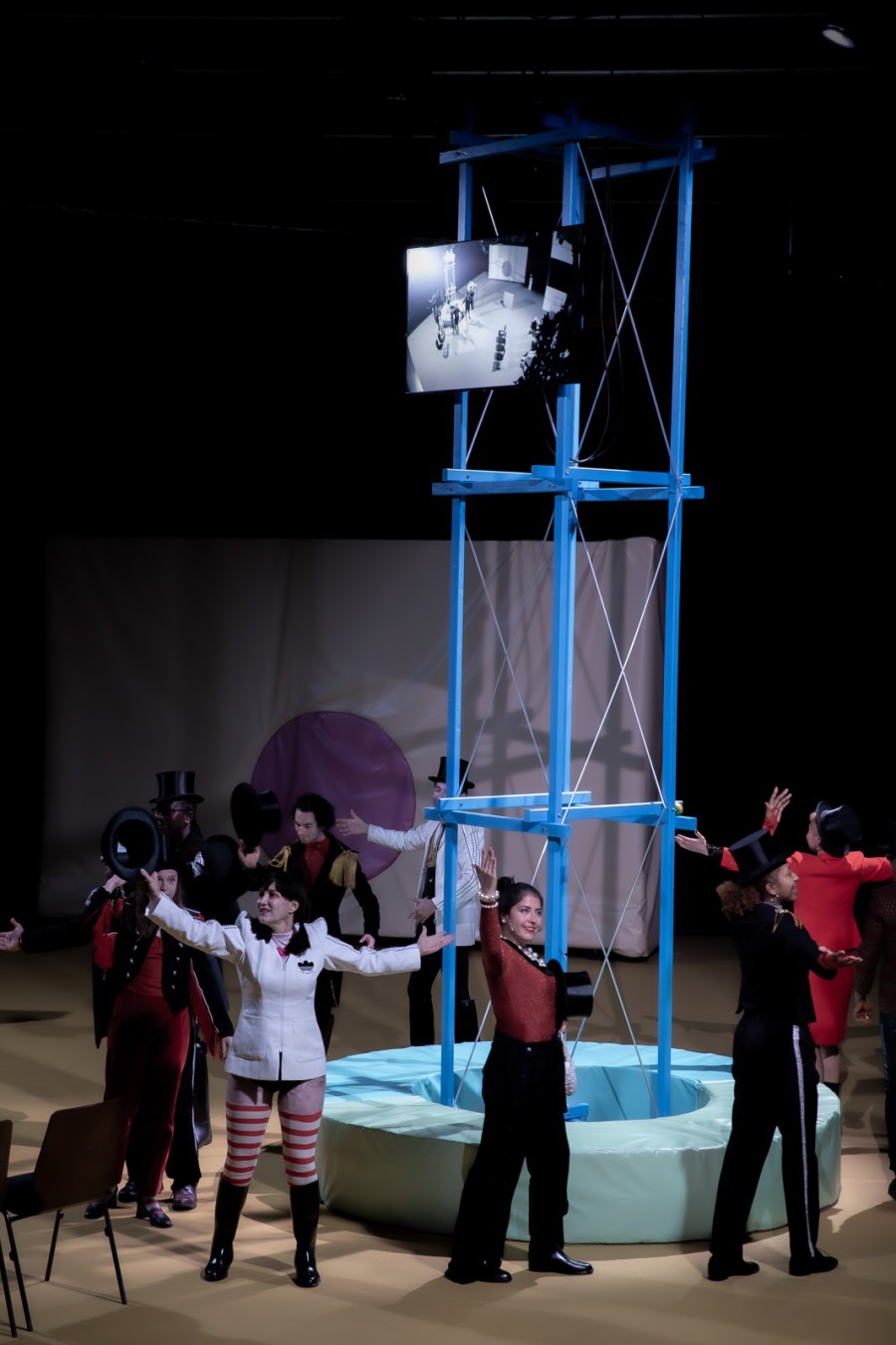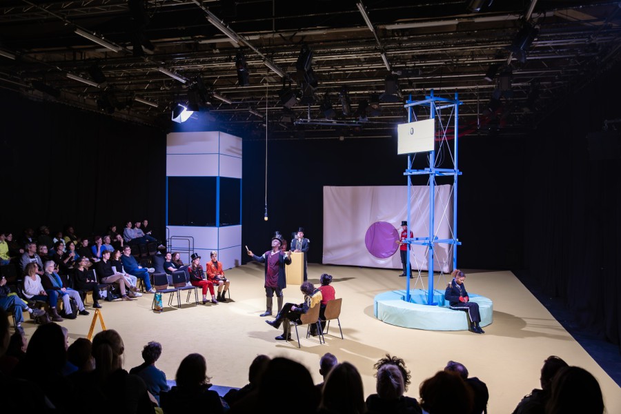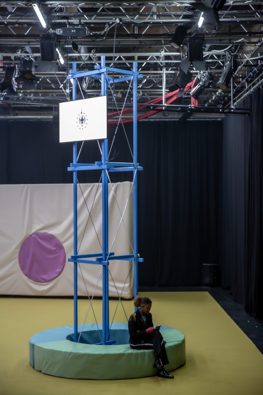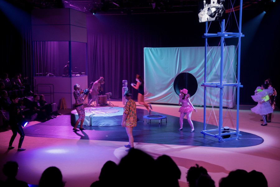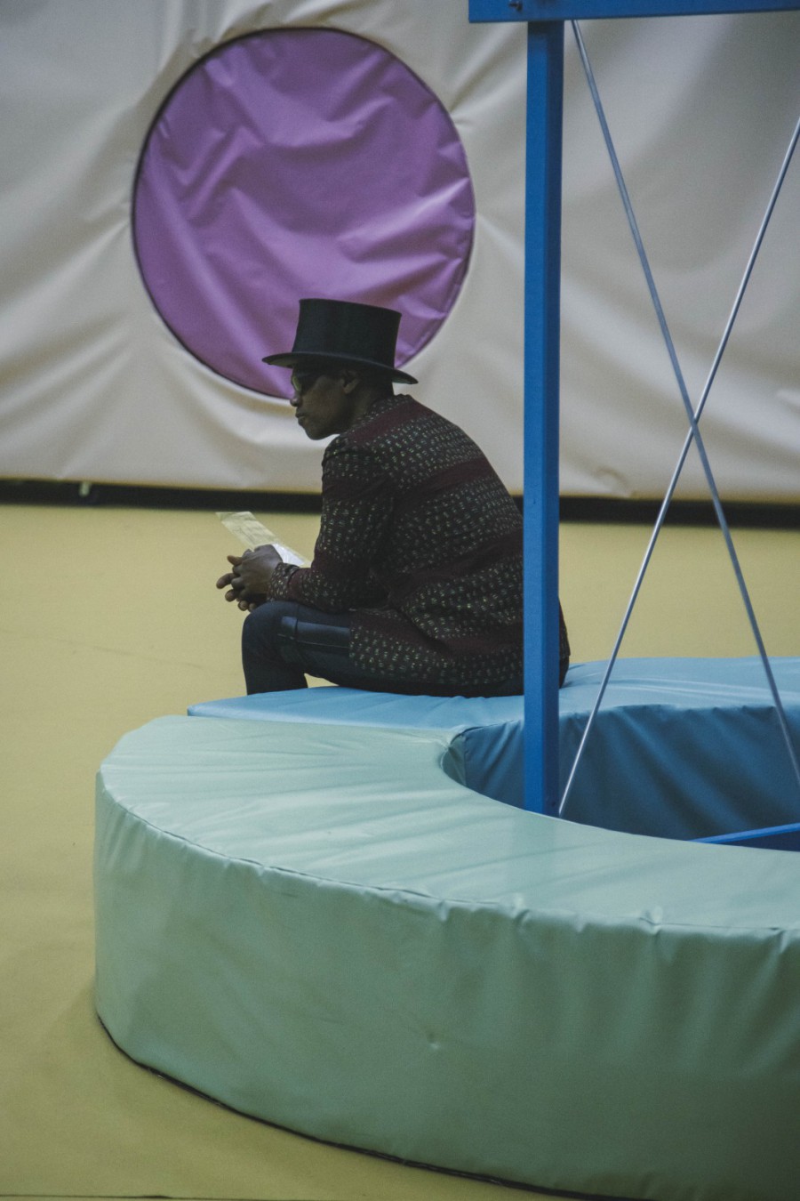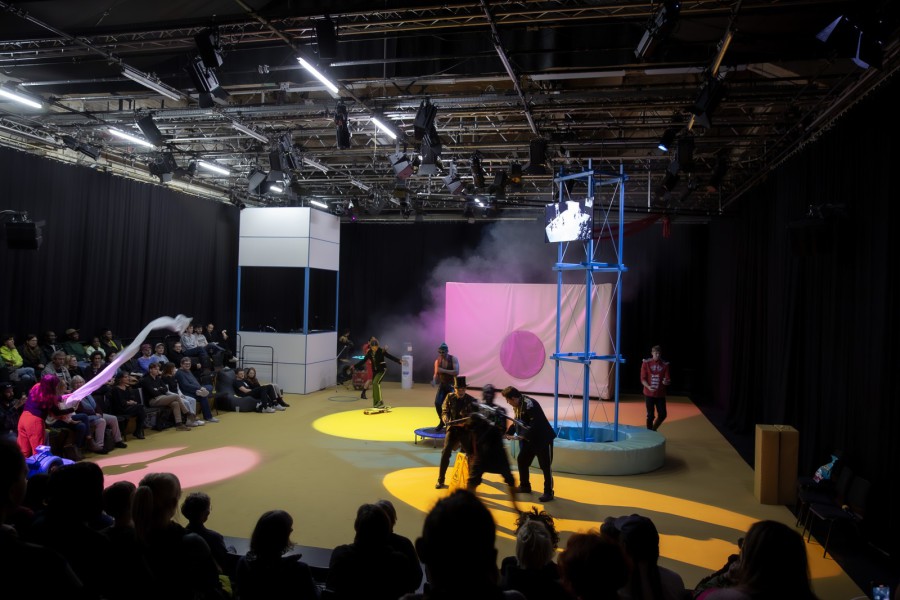 We transformed our space from a bland, coldhearted public office into a place for playful circus. With this functional cross-over of both spatial aesthetics, we resorted to a clear and at the same time fun formal language: the yellow floor as bold space-defining square, on which a two-part turquoise-green ring shape encloses a linear tower. This is followed by a big white rectangle, a violet circle in its centre. If there was no ring of fire for the missing lions to jump through, the performers in our bold mood shifting space invited the audience to do so — jump now, please, from one void to another. The irritatingly colorful look and feel of the space, which shifts from a dreary public office to a circus in love with form, ends in a playground space: the performers appropriated the objects and began to play with them until even the tower starts tottering. Spectacular gimmicks such as a moving smoke ring machine, a floating red circus tent and a large trampoline were not just entertaining props, but show the cold office turning into a circus turning into a playground, as an invitation to everyone to join. In the end: playing and living together is more fun.