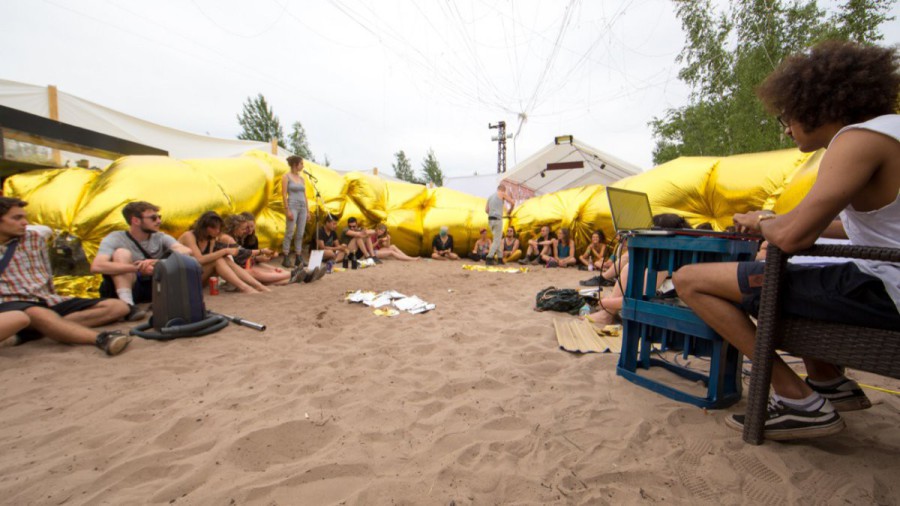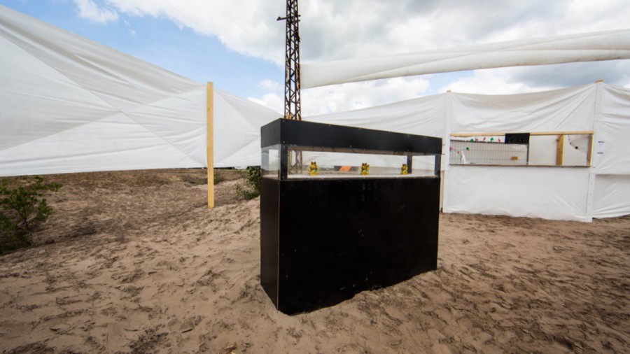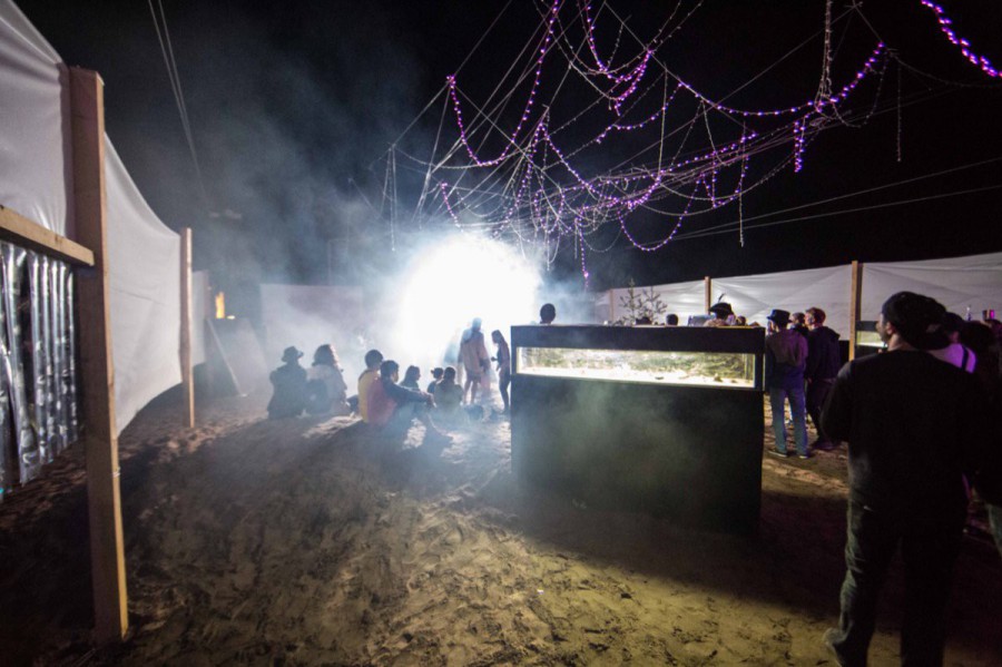 As diversity of perspectives and linkage to current social and global circumstances are crucial to us, we framed our stage concept for Feel Festival 2016 by asking: What is perceived as different or foreign and how strongly is perspective factored in? The space was filled with sand forming hills and valleys, culminating in a dune that was interrupted by the actual stage. The audience could take a look from different angles and put on a multitude of perspectives on artistic expressions on stage. We took the multiperspective approach also into account when placing two big showcases in the auditorium only to be watched when bending down to it.