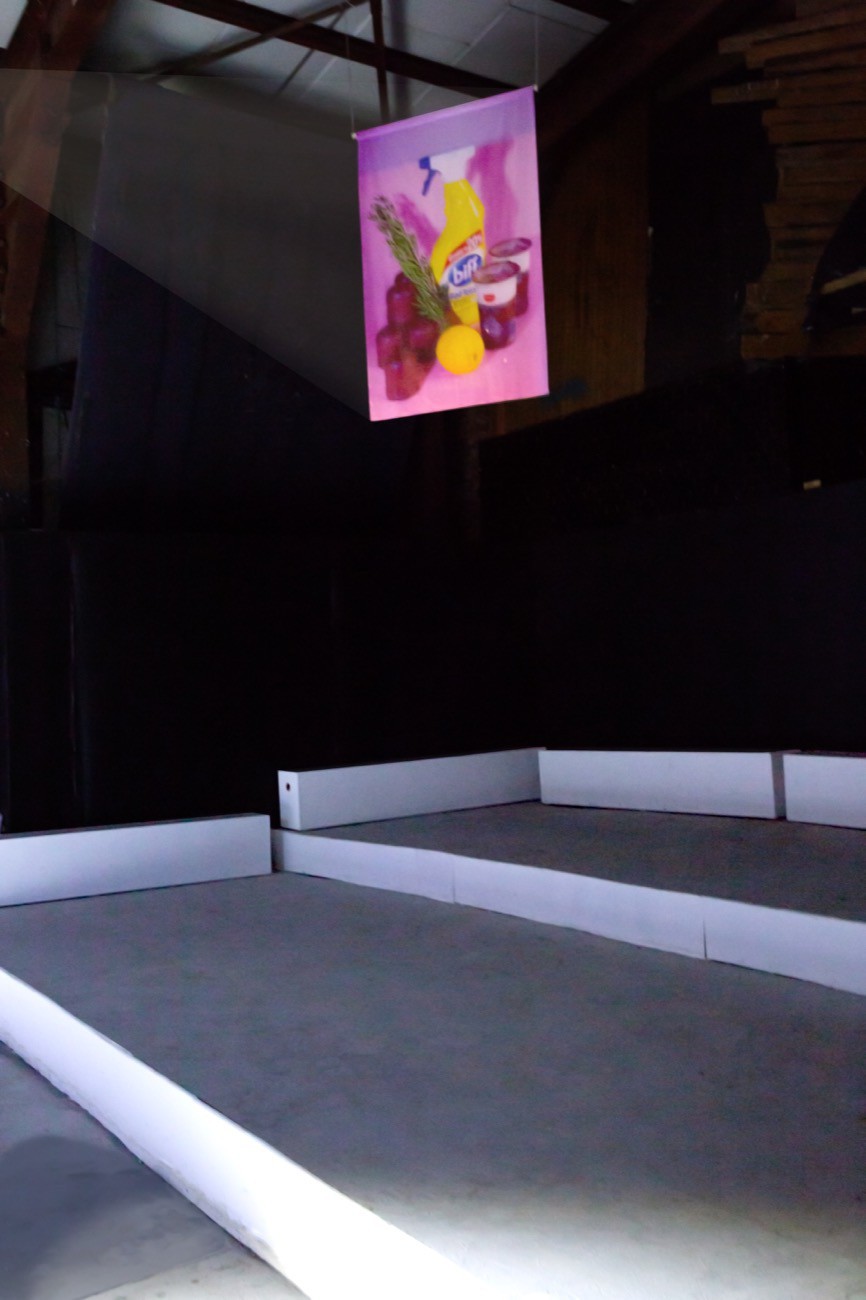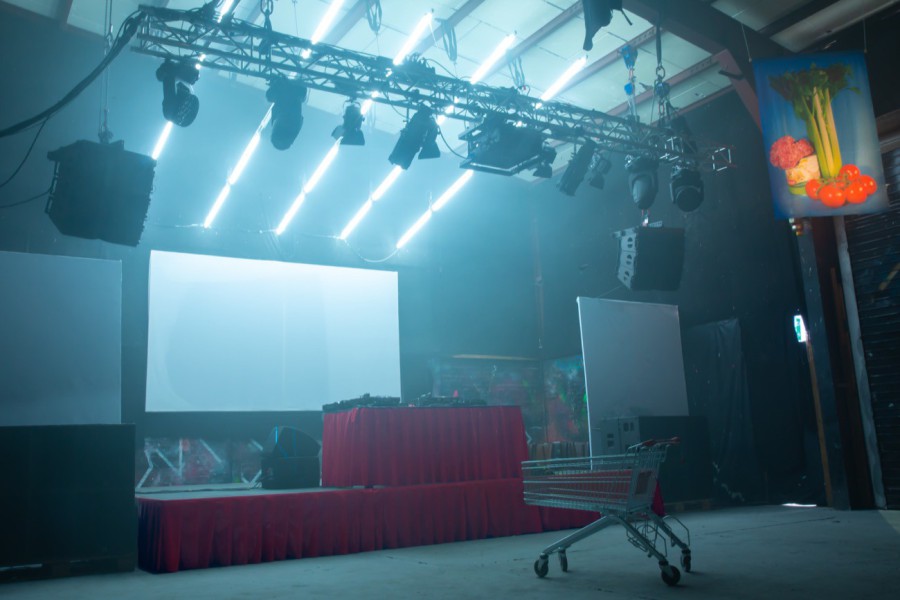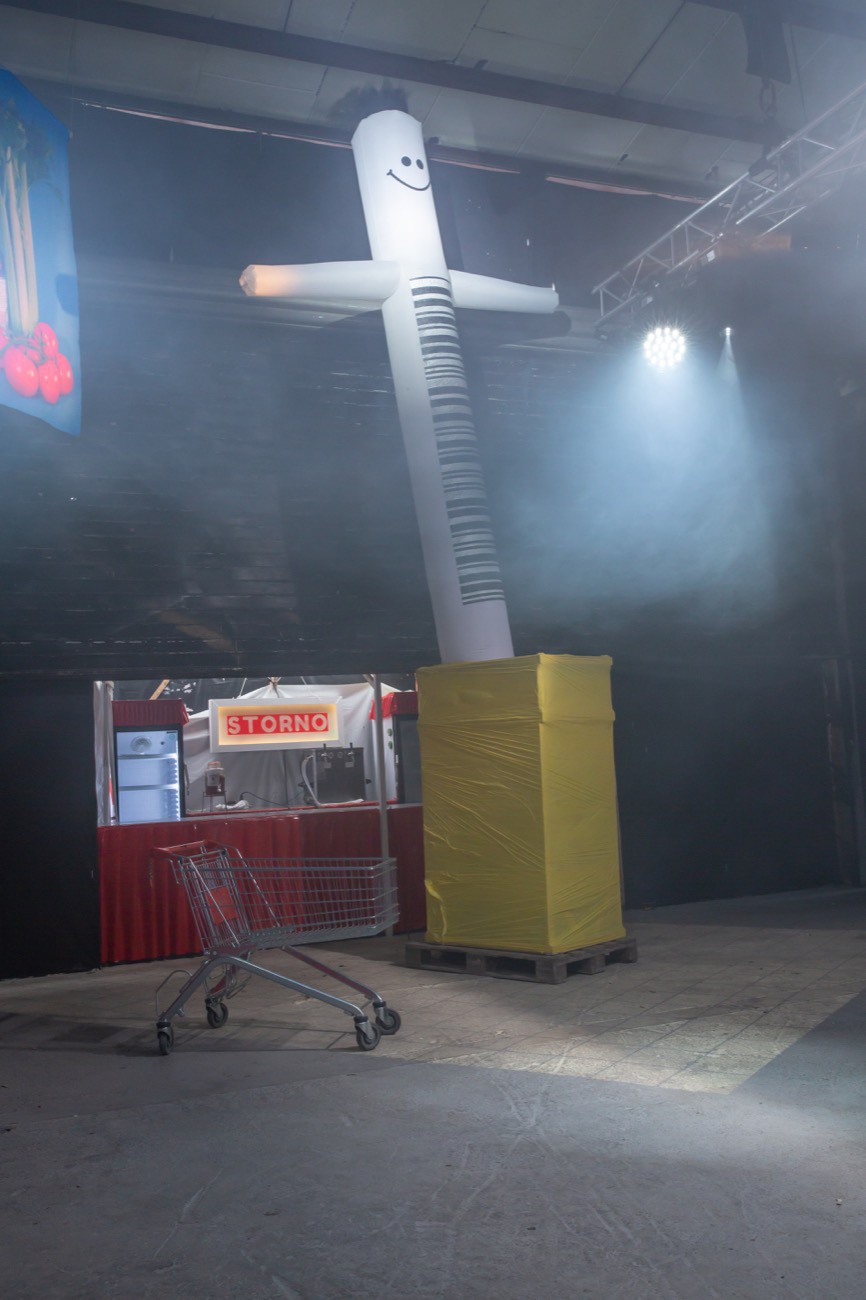 To round out our investigation on the theme "Supermarkt" during the 2019th edition of Fuchsbau Festival we created STORNO. After Hyperkultur and Epicenter it was time to dive into the narratives of an actual supermarket. For the stage hosting performances, DJ*ane sets and concerts we designed a collage of scenes from our most beloved stores. Hanging banners with artistic still lives from supermarket products are connecting the individual needs with surplus and mass production; colorful stacks of goods and fragments of well known supermarket floors.