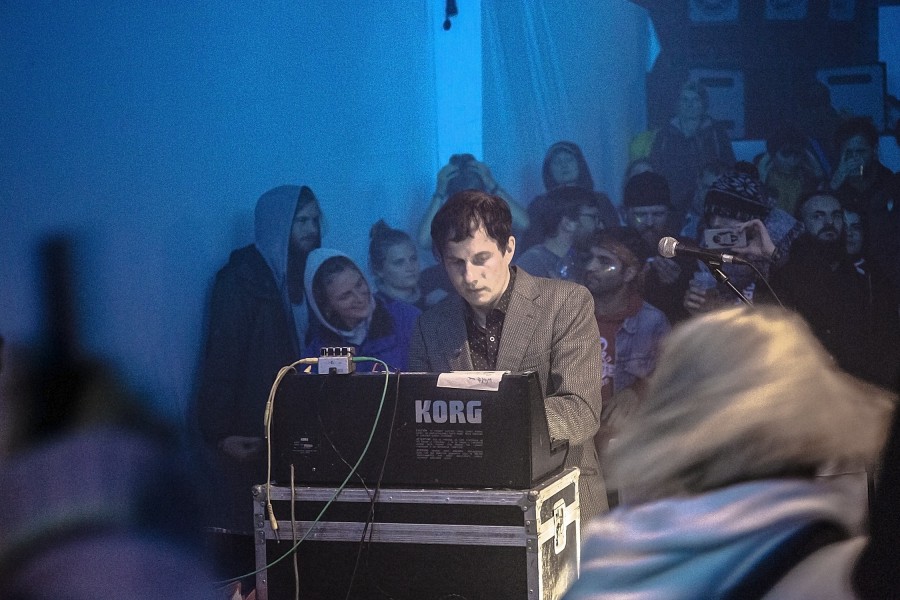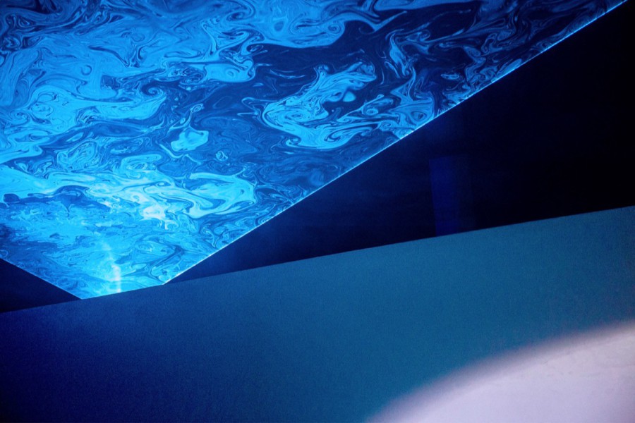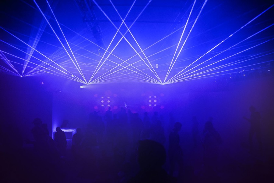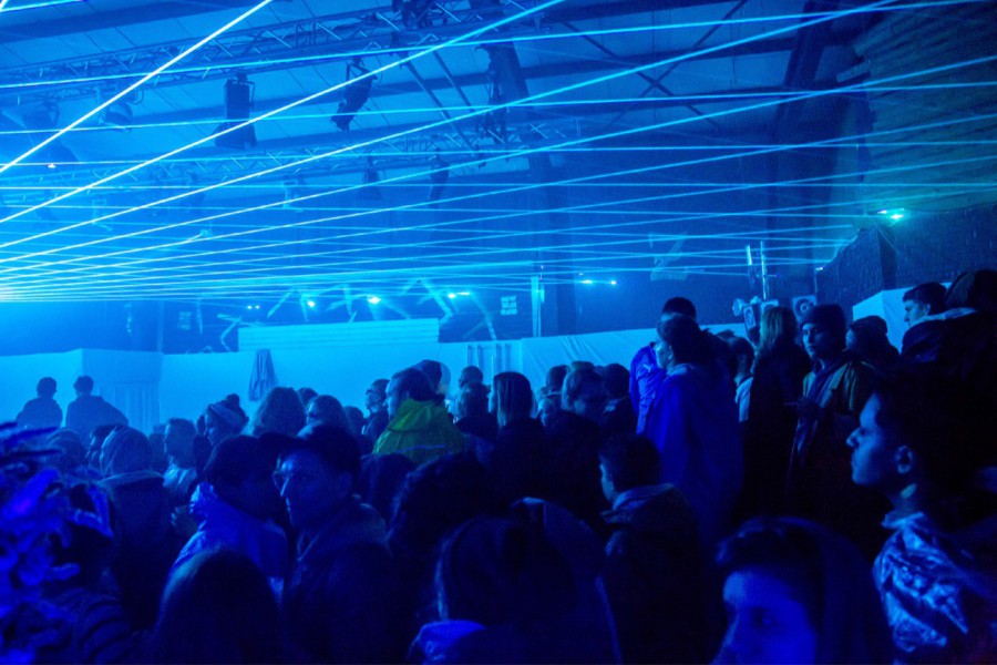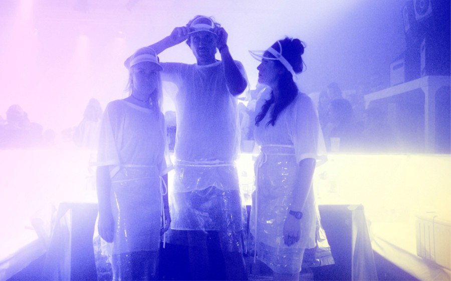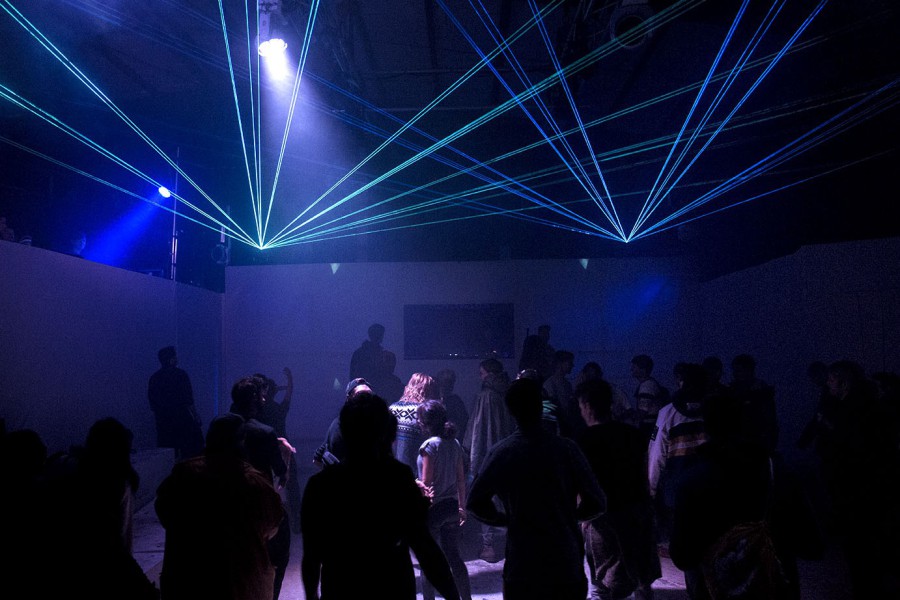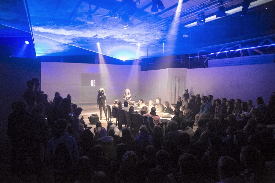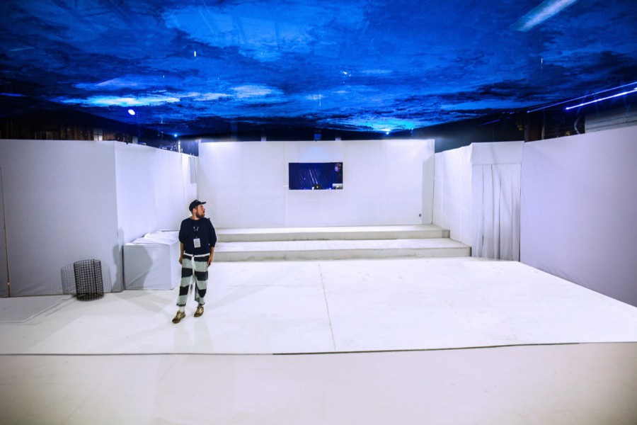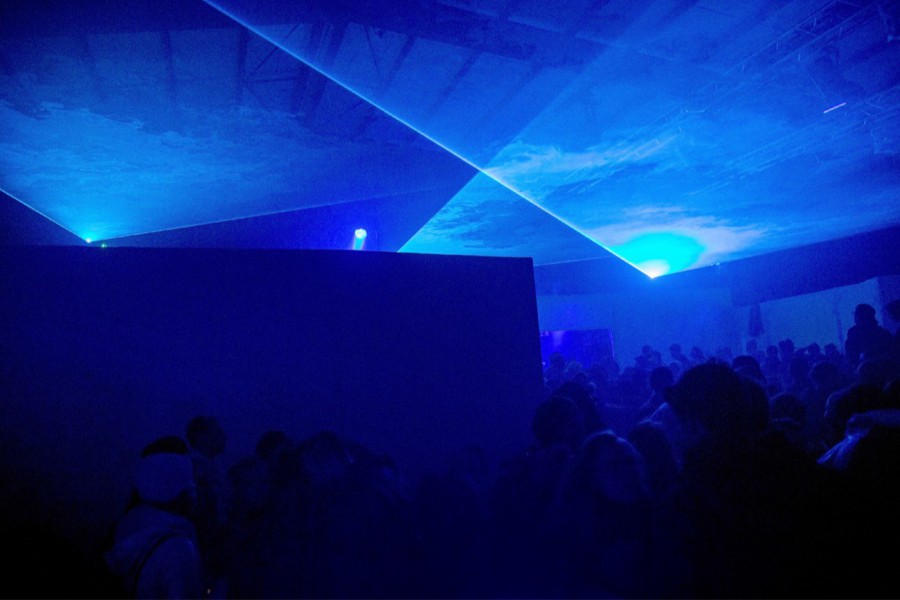 Approaching the topic of analog and digital realities, we decided to frame our stage design as both their juxtaposition and coming together. We covered the space in white by setting up 3 meter walls, topped by laser surfaces installed in the ceiling. Four laser projectors beamed blue triangles fusing with constant haze to shape a clear structured, yet diffuse cloudy space ceiling.