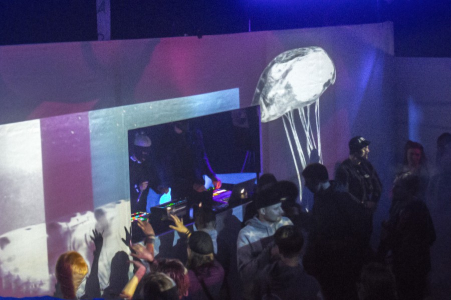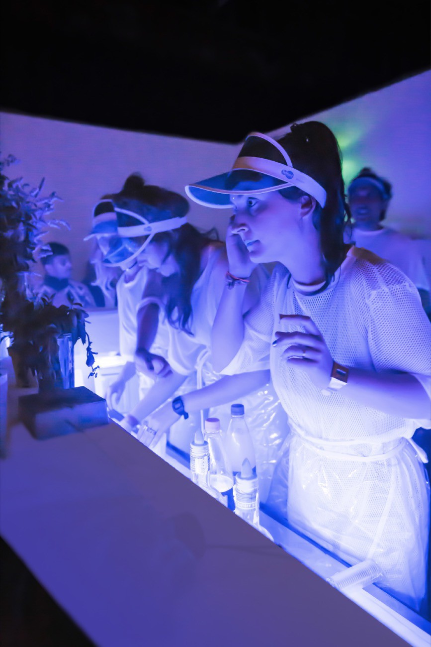 The DJ*ane booth aimed to be a literal surface: the musicians were behind a half transmitting mirror, only to be seen when they’re illuminated. The bar on our SURFACE stage was a collaboration with Felina Levits, who also designed the bartenders’ workwear. The special liquor mixes, offering topic matching drinks like Display Port or Fullscreen, also color fitted to the space design.